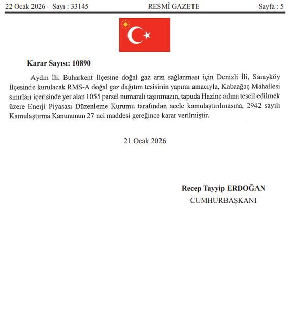 Aydın’ın Buharkent ilçesine doğal gaz ulaştırılması için kritik bir adım atıldı. Resmi Gazete’de yayımlanan kararla, Denizli’nin Sarayköy ilçesinde kurulacak RMS-A doğal gaz dağıtım tesisi için Hazine adına acele kamulaştırma yapılacak. Resmi Gazete’de ... haberin devamı için tıklayın