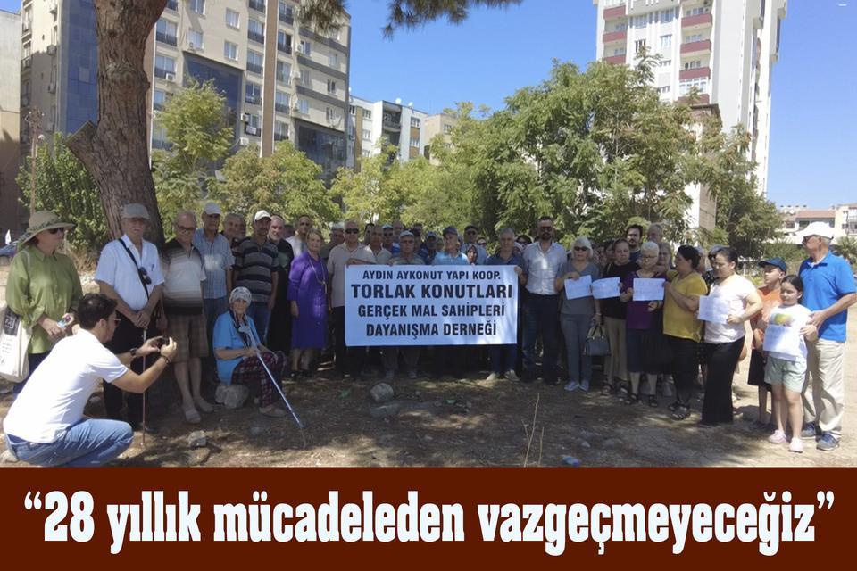 Aydın’da 28 yıldır ev hayali kuran Ay-Konut Yapı Kooperatifi Kaynak Konutları Gerçek Mal Sahipleri Dayanışma Derneği üyeleri, bir kez daha basın açıklaması yaparak seslerini duyurmaya çalıştı. Güzelhisar Mahallesi Torlak Mevkii’nde bulunan ve çeyrek asırdır atıl vaziyette bulunan alanda toplanan mağdurlara seslenen Dernek Başkanı Meral Uğur, tek umutlarının yargı süreci ve dayanışma olduğunu ifade etti.